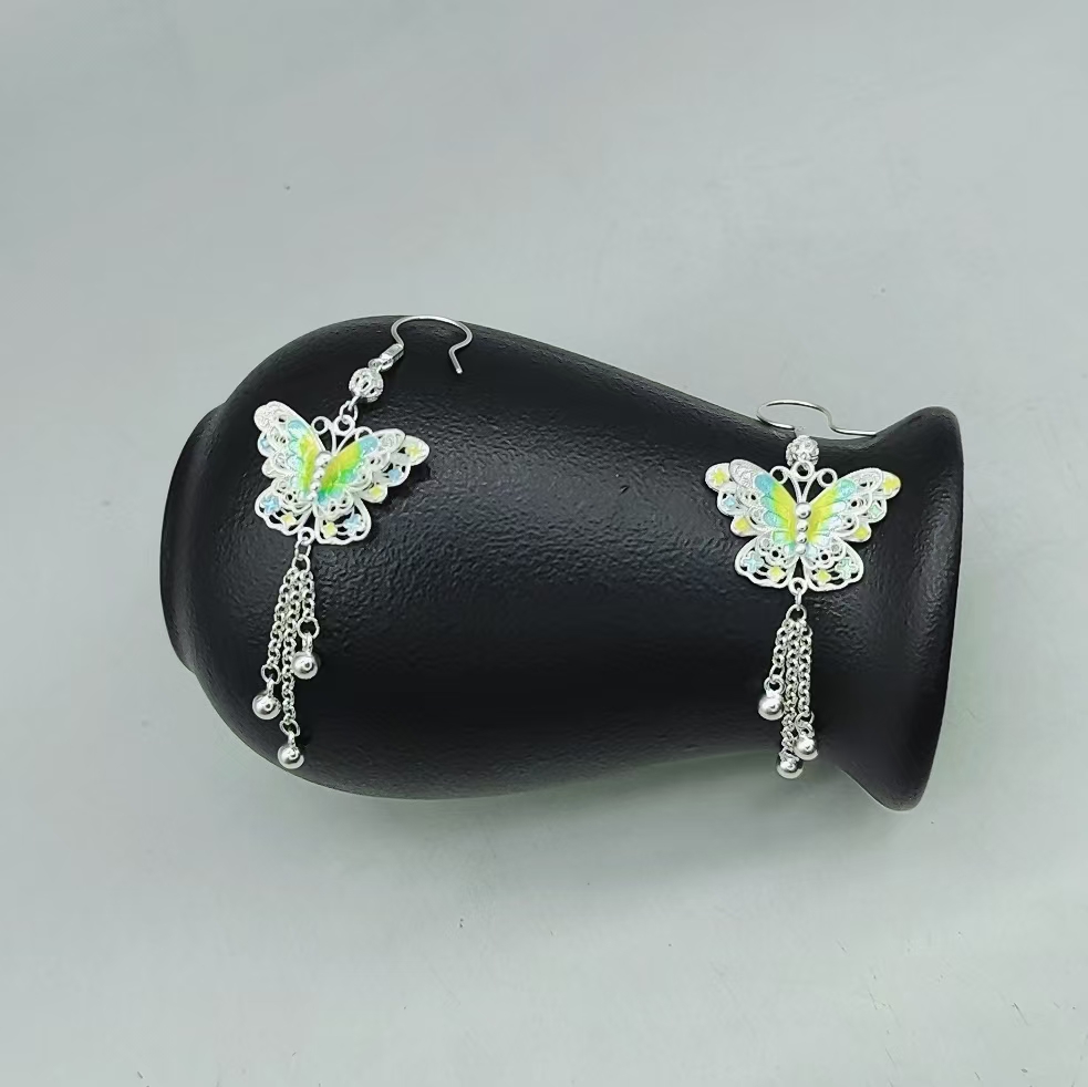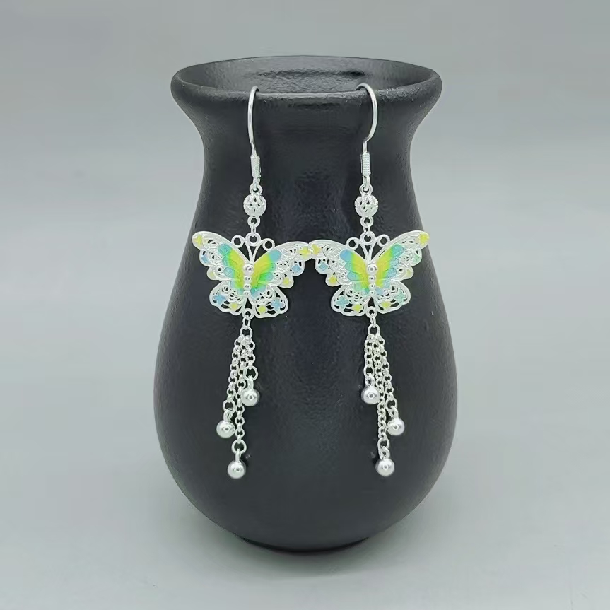 Original Handmade Women’s Pure Silver 999 Earrings Pendant Flower Silk Ethnic Style Fringe Earrings