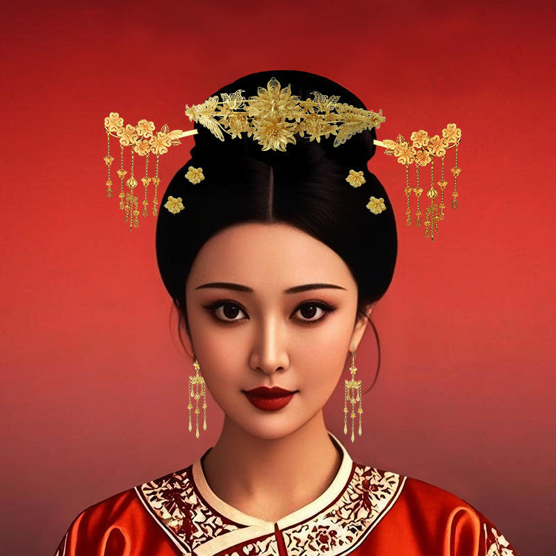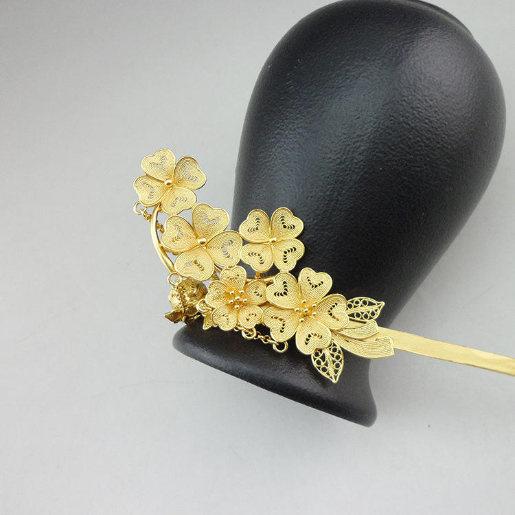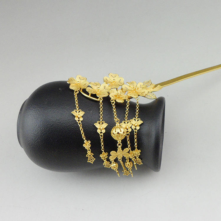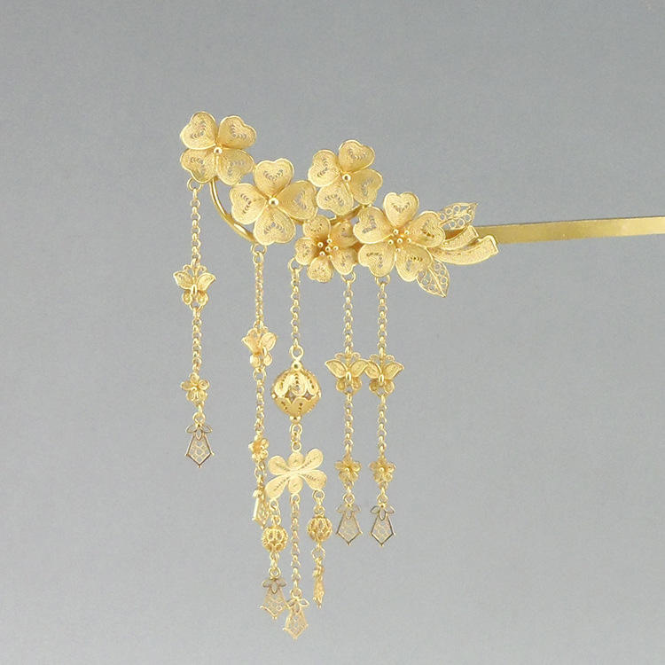 Featuring a delicate gold floral cluster (embellished with hollow-out and engraved details, echoing classic plum blossom/peach blossom motifs in Chinese culture), the hairpin is adorned with layered dangling tassels that sway gently with movement, adding a graceful, dynamic touch to your hairstyle.The original design intention was to fix the updo while also serving as a striking decoration. This hairpin is perfect for Hanfu looks, Chinese weddings, traditional festivals, and even daily retro-style outfits, integrating Chinese aesthetics with modern wearing practicality.