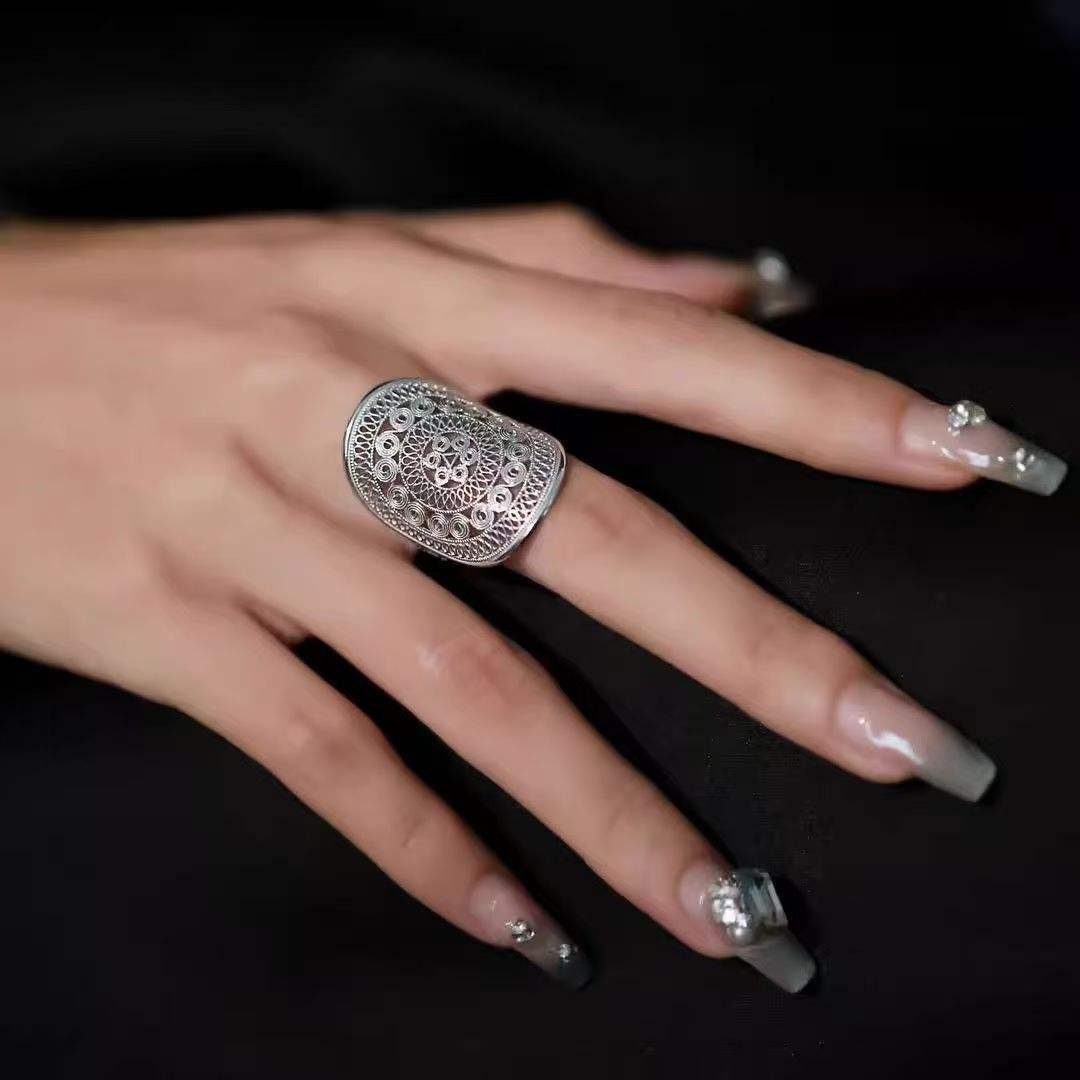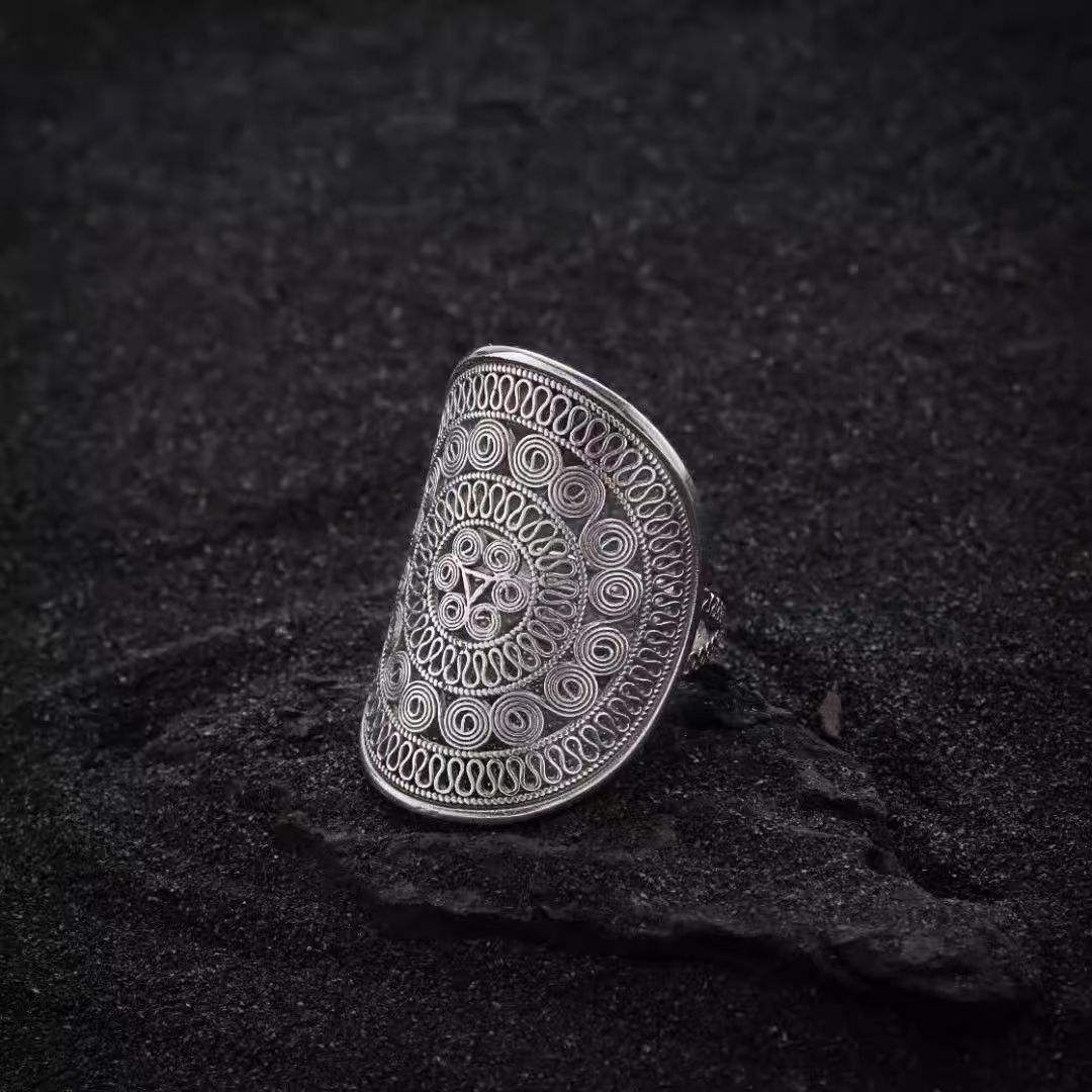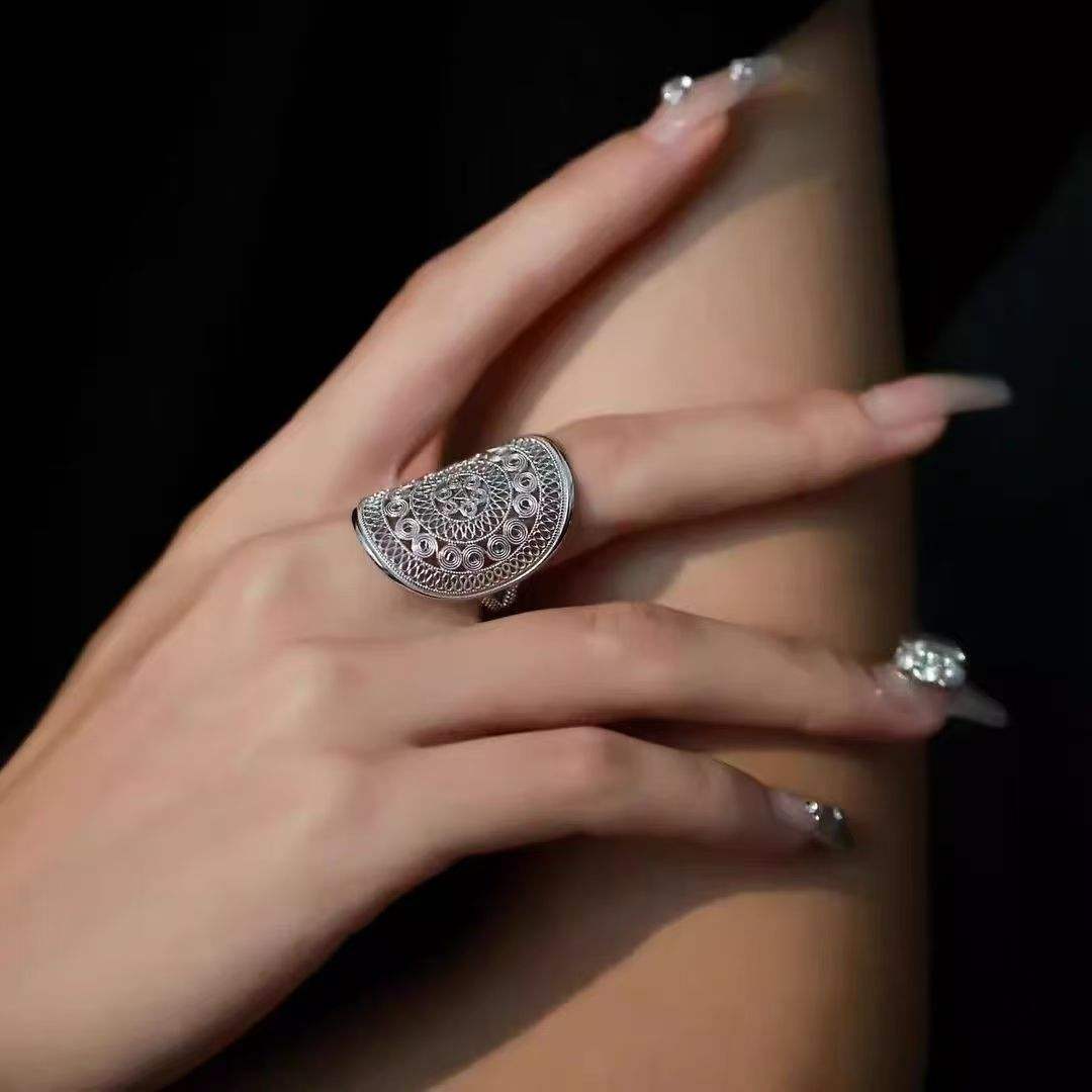 jewelry collection with this exquisite Neo-Chinese Hmong index ring—where minimalist luxury meets traditional ethnic charm. Inspired by the sacred bronze drum culture of the Hmong people, the ring features a refined “Bronze Drum Flower” motif, reimagined through a modern minimalist lens to blend seamlessly with contemporary style.