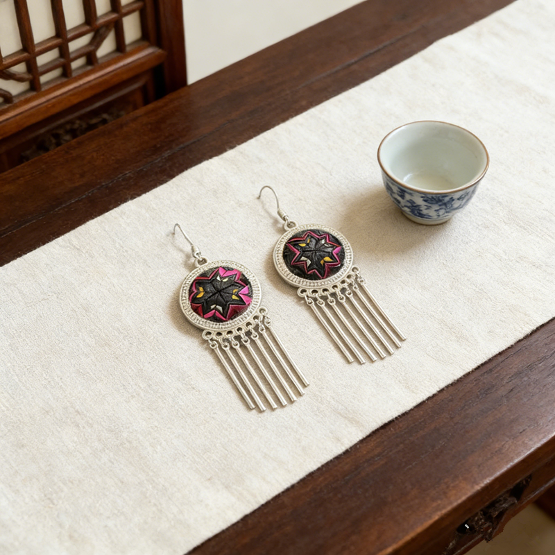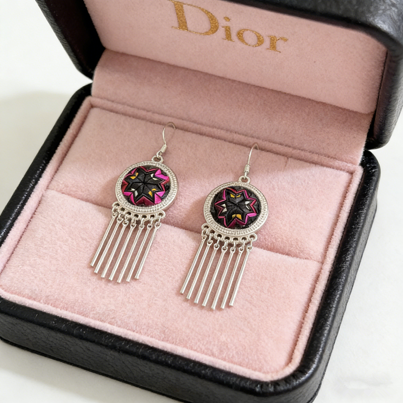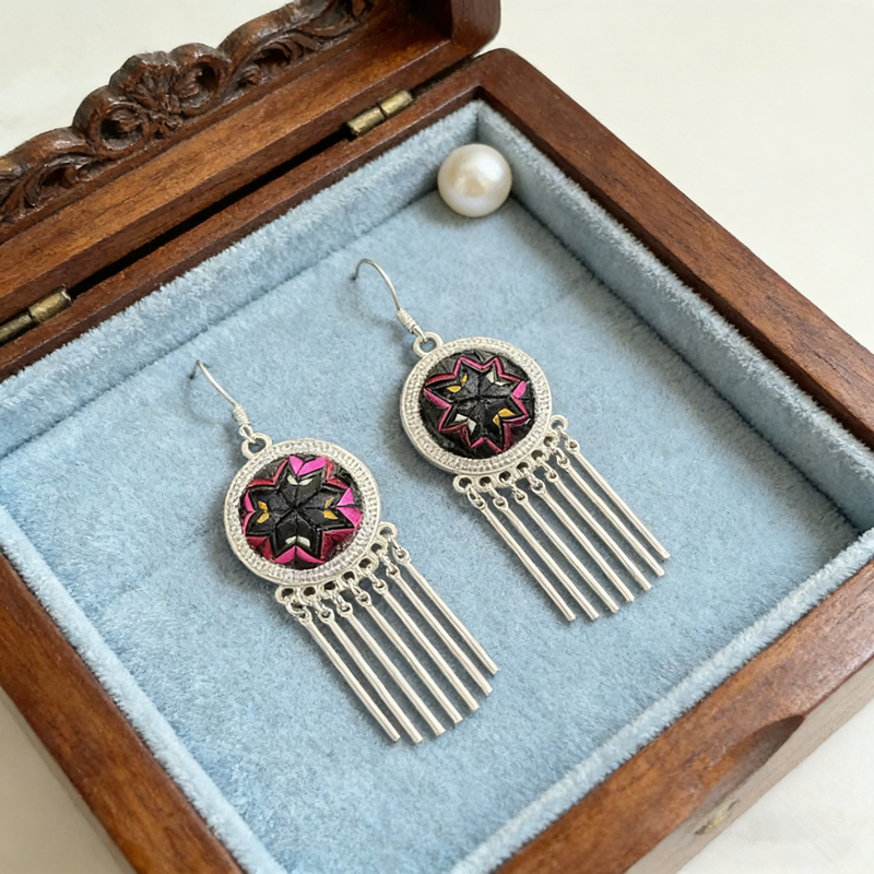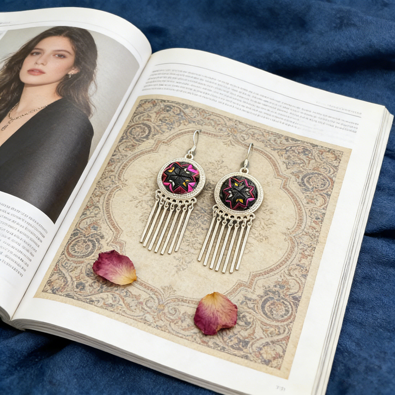 Step into vibrant boho style with these eye-catching earrings! A handcrafted geometric starburst center—featuring bold pink, black, and purple tones—rests in an ornate silver frame, finished with sleek, swaying tassels that move with you. Lightweight and full of ethnic charm, they’re the perfect statement piece to elevate any outfit.